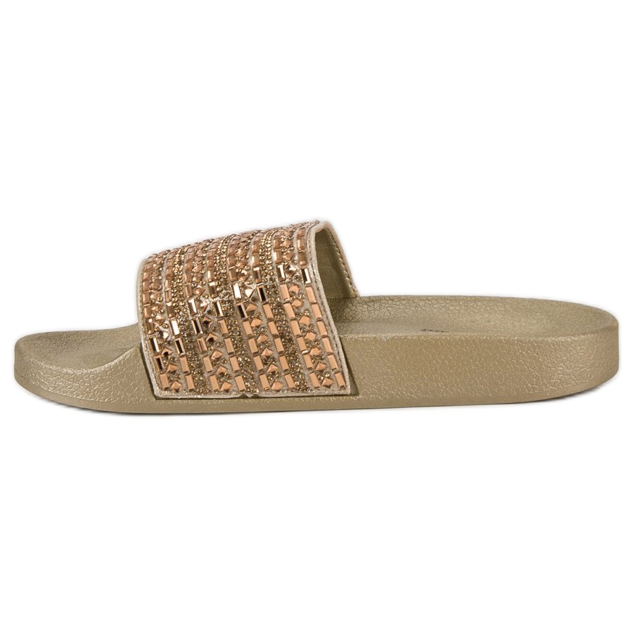 Fabricados em borracha de alta qualidade, são leves e flexíveis, o que os torna perfeitamente ajustados ao pé. A cor dourada confere-lhes um brilho fenomenal e os strass adicionais enfatizam seu caráter único, tornando-os um elemento definitivo de qualquer estilo de verão.