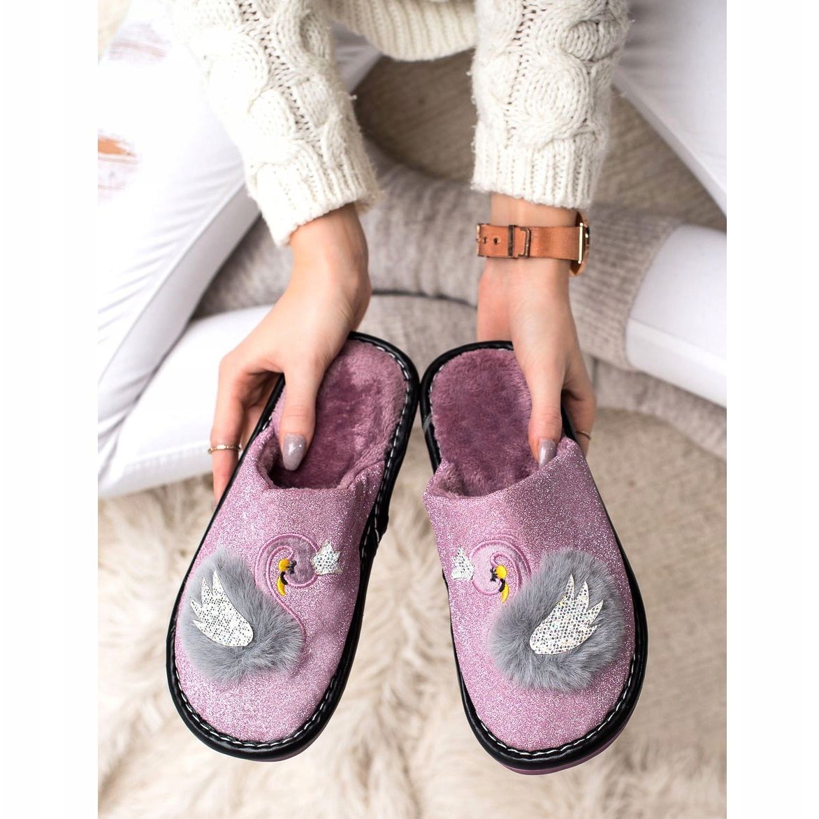 Descubra conforto e estilo no dia a dia com os chinelos Bona. Estes encantadores chinelos roxos encantam não só pela cor, mas também pela original aplicação em forma de cisne que lhes confere um carácter único. Confeccionados em material brocado, têm um visual moderno e elegante, e o pelo macio por dentro garante conforto mesmo nos dias mais frios.