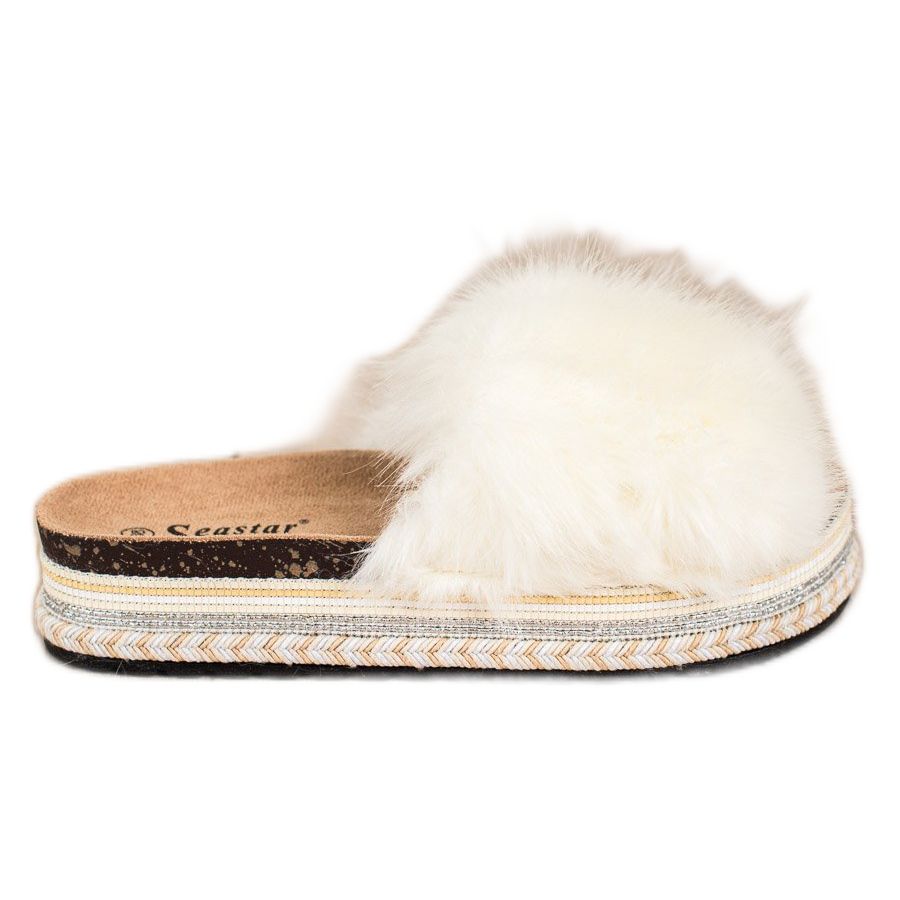 Descubra as tendências do verão com chinelos da moda em uma plataforma decorativa do fabricante Seastar! Estes chinelos brancos distinguem-se não só pelo seu aspecto elegante, mas também pelo conforto de uso e pelos materiais ecológicos. A pele macia e totalmente ecológica envolve os pés e a palmilha em tecido garante conforto durante todo o dia. Nas caminhadas diárias, você poderá desfrutar de leveza graças à sola sintética com banda de rodagem que proporciona boa aderência.