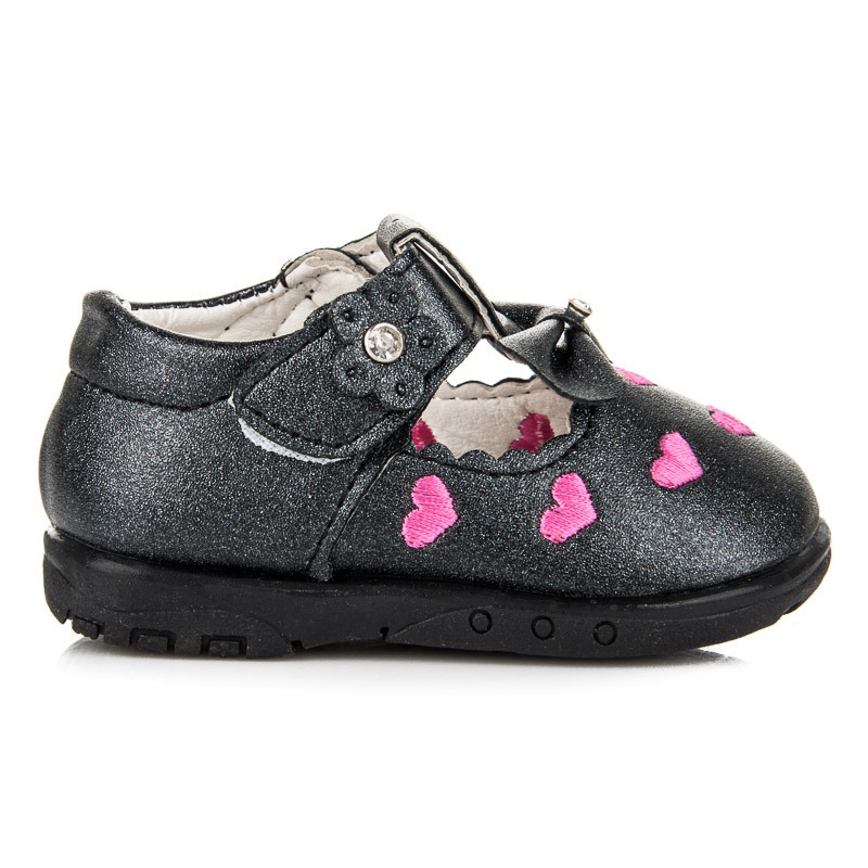 Os corações negros com corações são bailarinas fofas e práticas criadas para os mais jovens. Feito de couro ecológico, perfeito para a temporada de primavera/verão. Um arco delicado lhes dá charme feminino, e o fixador de velcro facilita a instalação e a remoção de crianças pequenas.