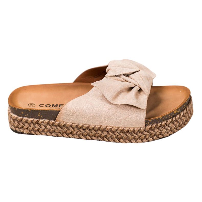 Feitos em imitação de camurça, os chinelos têm um aspecto elegante e o laço decorativo confere-lhes um charme único. As inserções em couro ecológico garantem conforto e conforto mesmo após uso prolongado, o que os torna a escolha ideal para a primavera e o verão.