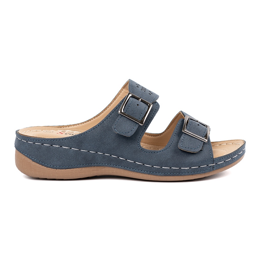 Slippers em um Seastar de cunha baixa em azul é uma ótima opção para todas as mulheres que querem combinar conforto com uma aparência elegante. Esses chinelos clássicos com uma altura do Koturna de 4 cm não apenas modelam confortavelmente a figura, mas também aumentam opticamente as pernas, tornando -as um complemento perfeito para as estilizações de verão.
