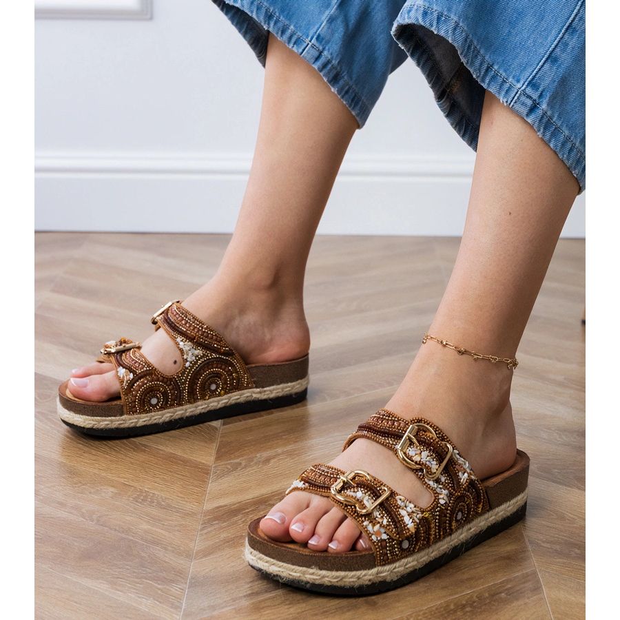 Descubra os chinelos étnicos marrons com grampos em listras, que são uma combinação perfeita de estilo e conforto. Feito em uma bela cor de camelo, esses chinelos clássicos são a escolha perfeita para dias mais quentes, adicionando um sotaque elegante a cada estilização.