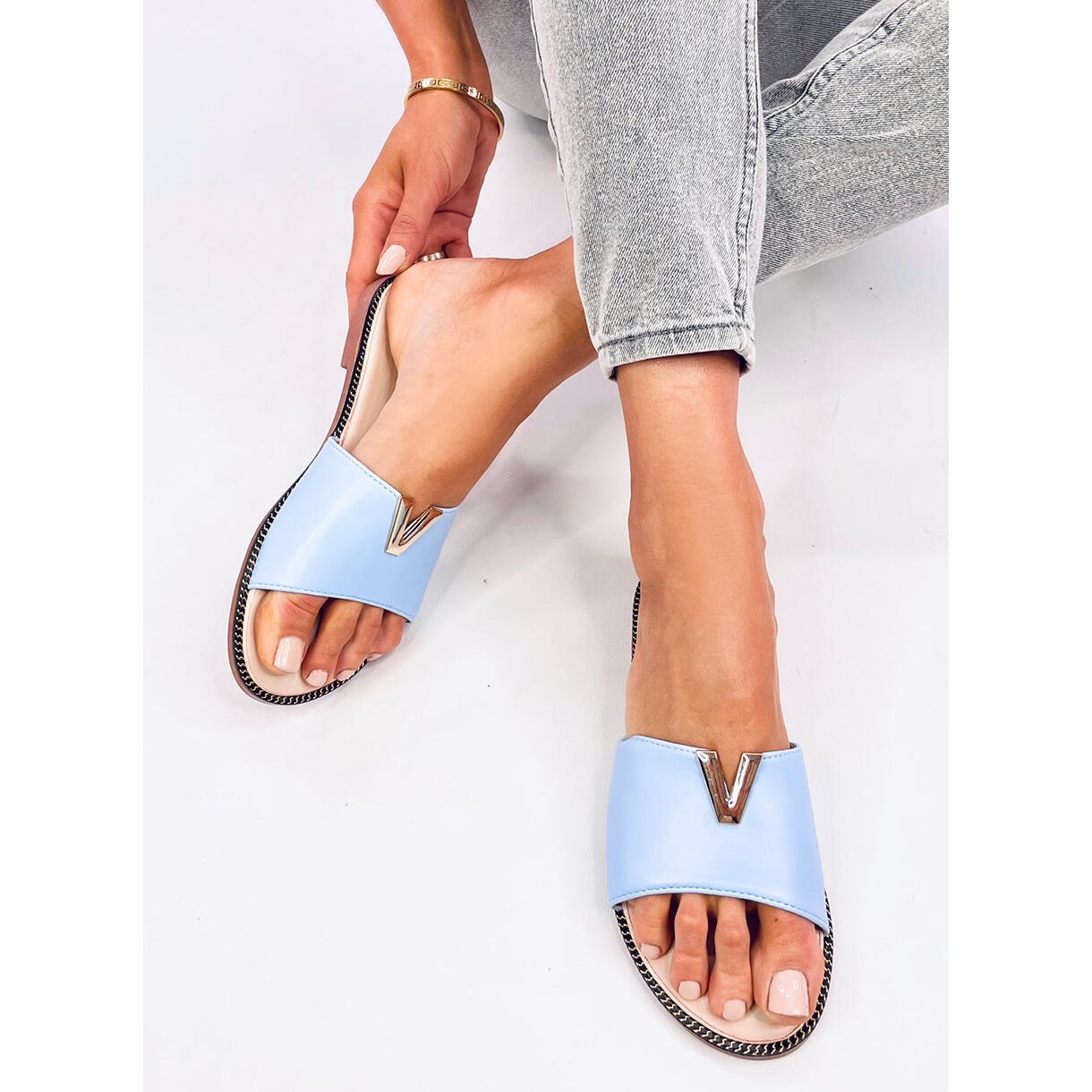 Botas femininas Willow Blue Slippers - Minimalismo azul, elegante com um brilho sutil. Os chinelos feitos de couro ecológico atraem atenção com uma decoração de ouro em forma de ouro, o que lhes dá um sotaque distinto, mas moderado. Perfeito para todos os dias, estilizações casuais - para passear, trabalhar em dias quentes ou para se encontrar com os amigos.