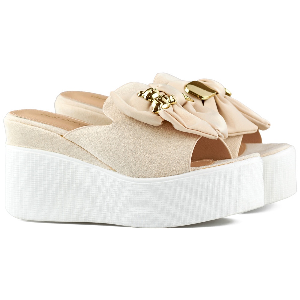 Descubra os chinelos femininos de bege exclusivos com um ursinho de pelúcia e um arco na cunha, que se tornará um must-have em seu guarda-roupa de verão! Esses chinelos elegantes de uma marca respeitável, feitos de camurça ecológica de alta qualidade, combinam estilo e conforto, perfeitamente adequados para todos os dias.