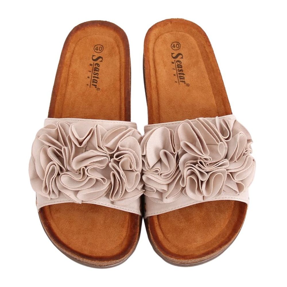 A parte externa dos chinelos é confeccionada em camurça ecológica de alta qualidade, o que agrega elegância e estilo. O modelo também é ricamente decorado com uma linda aplicação, que acrescenta um toque de originalidade e enfatiza o caráter único deste calçado. Os chinelos F191 são a escolha perfeita para o estilo do dia a dia - combinam perfeitamente com vestidos, shorts e saias de verão.