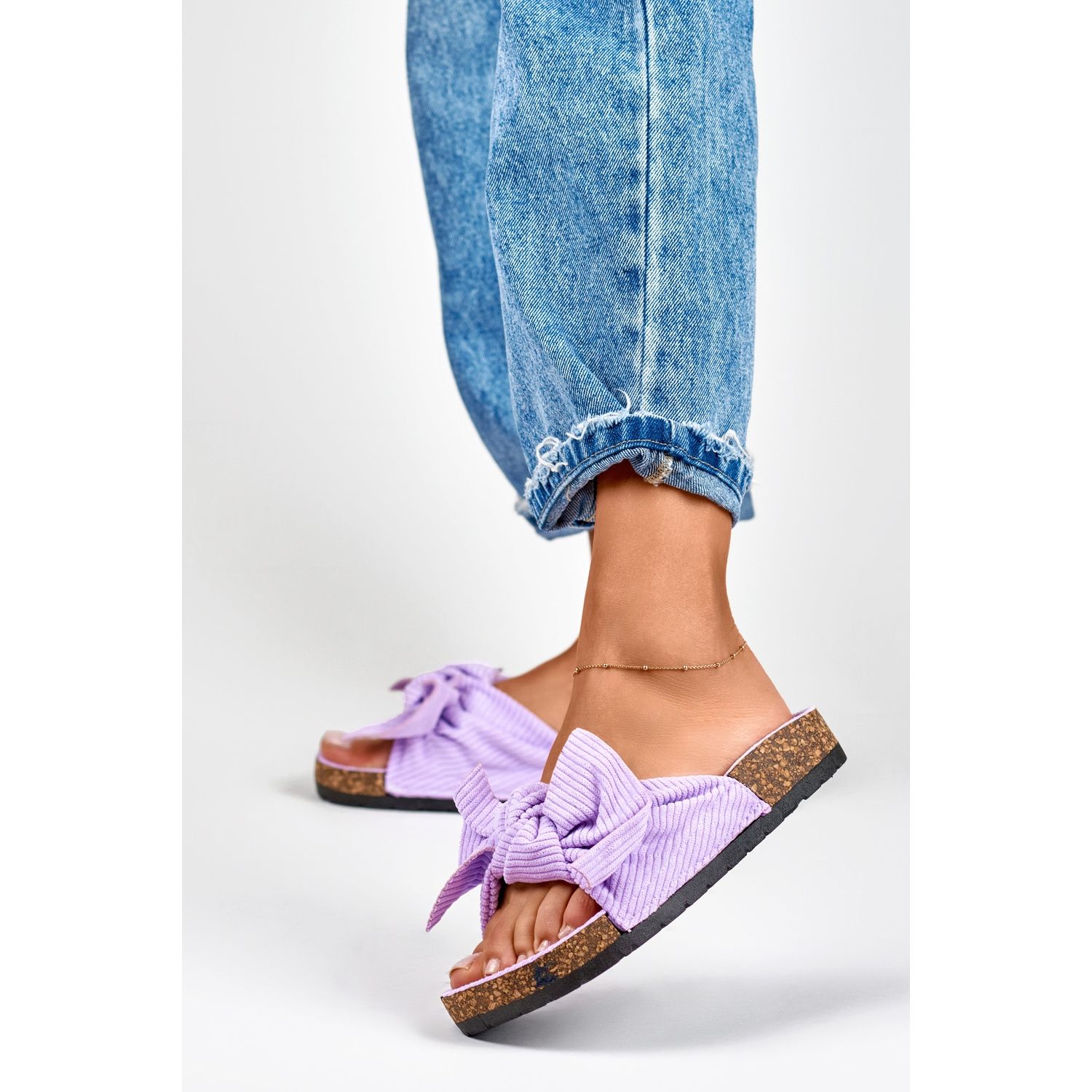 Detalhes: Chinelos femininos clássicos de camurça roxa com laço roxo
