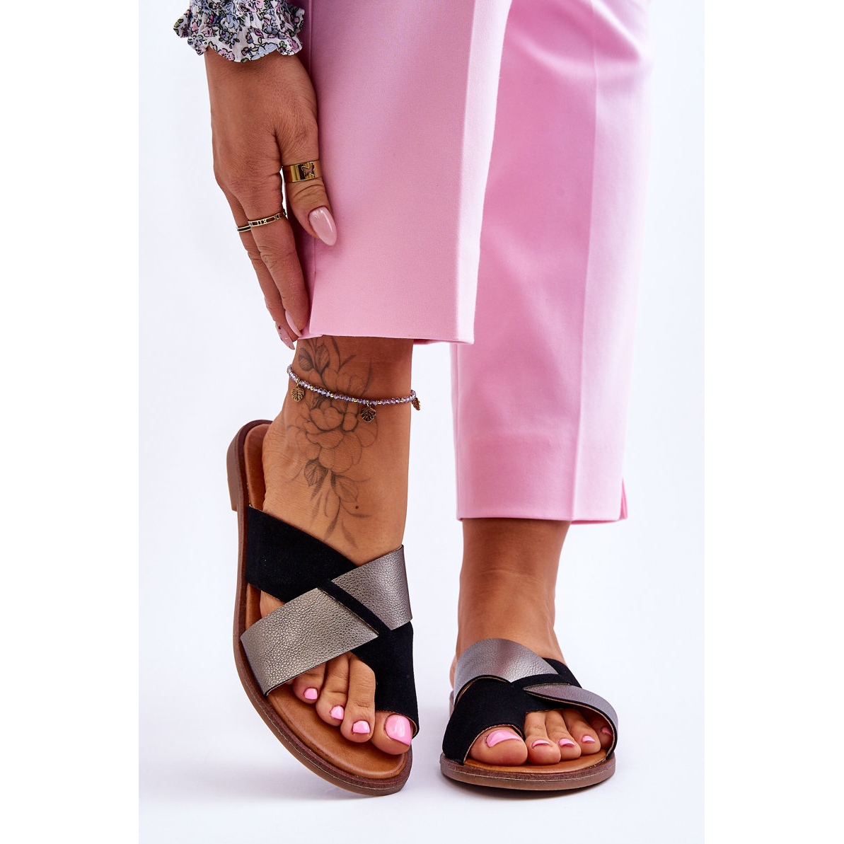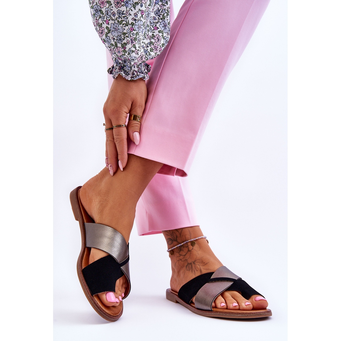 Inna marka Chinelos femininos clássicos de couro preto platina Nancy