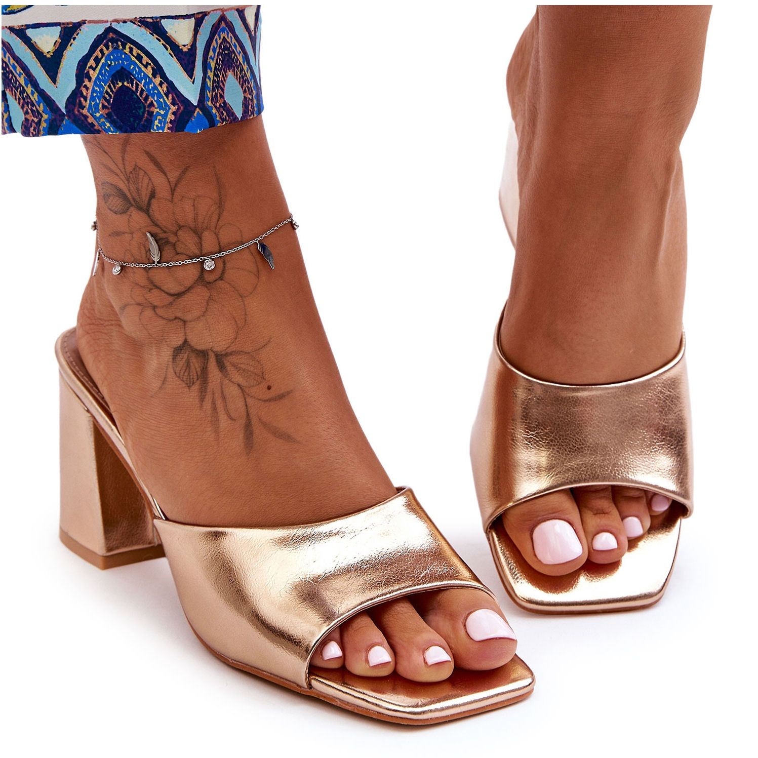 Este modelo é caracterizado por uma biqueira aberta e quadrada, que adiciona um toque moderno. A palmilha confortável, também confeccionada em couro ecológico, garante conforto de uso por longas horas, e o salto bloco de 7,5 cm de altura torna os chinelos não só estilosos, mas também estáveis.