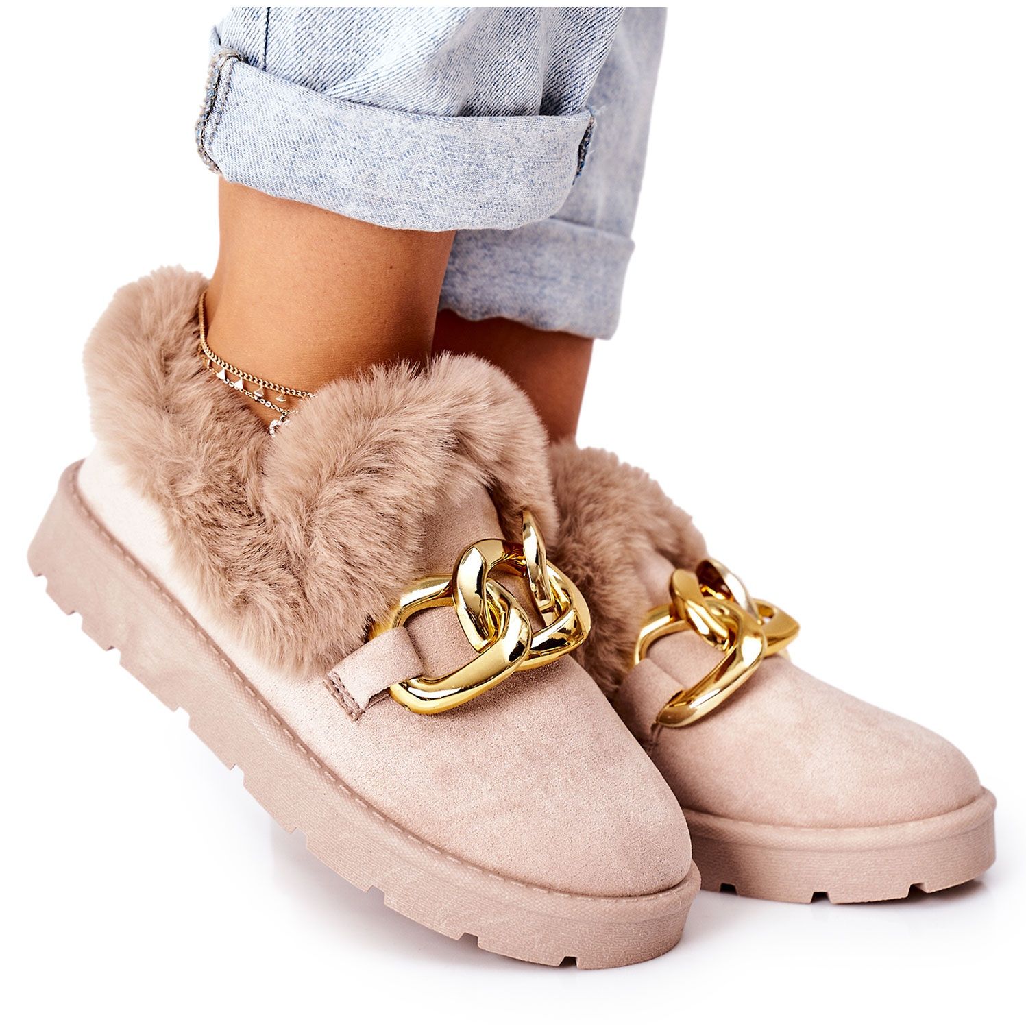 Os chinelos são cuidadosamente confeccionados em pele sintética agradável ao toque, o que garante não só o conforto ideal, mas também o calor nos dias frios. Uma vantagem adicional é uma atraente corrente de ouro que lhes confere um caráter elegante e moderno. Graças a isso, o acessório torna-se um complemento perfeito tanto para estilos do dia a dia quanto para estilos mais sofisticados.