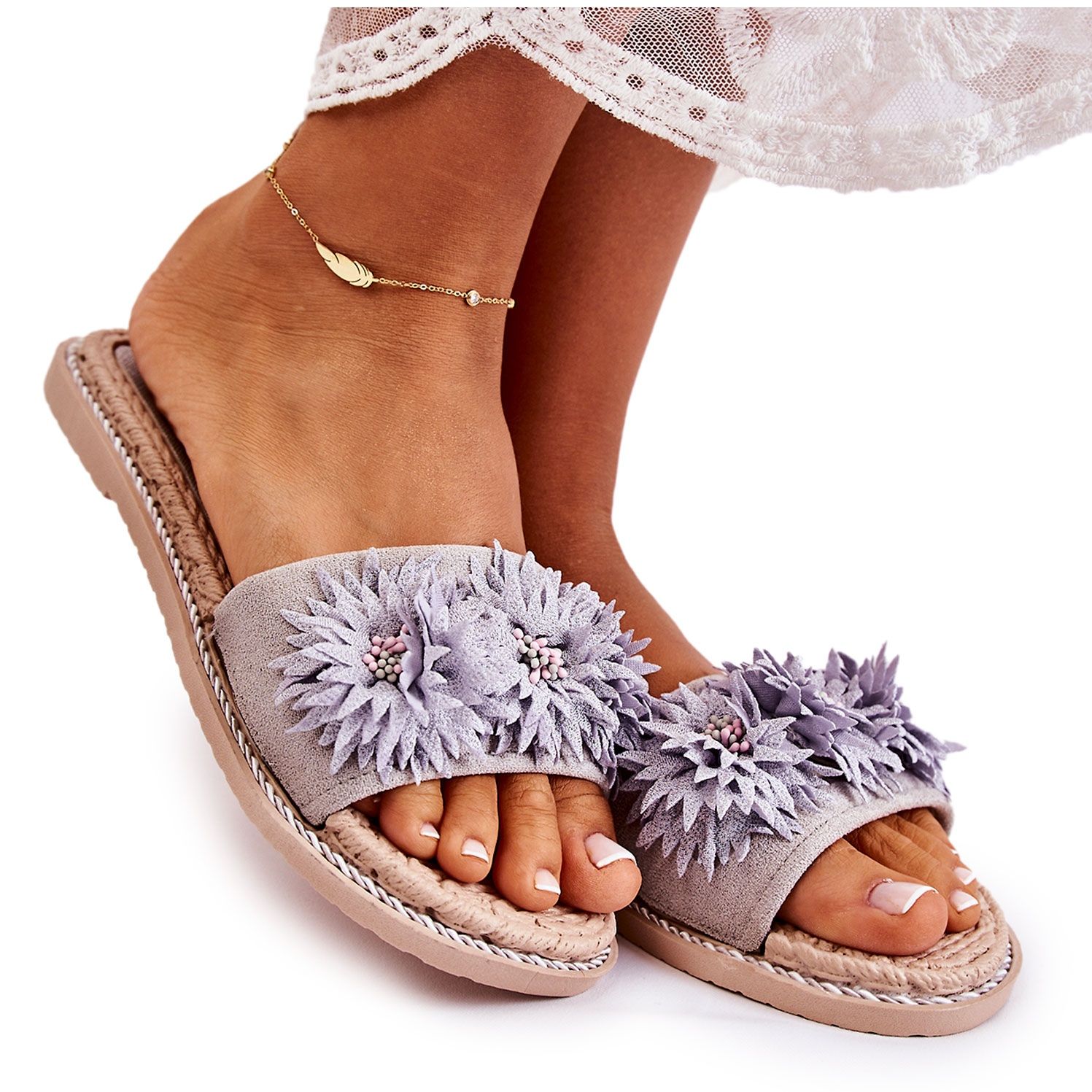 Apresentamos os Chinelos Femininos WJ1 com Flores em Tecido num elegante tom cinzento da Susana, que se adaptam perfeitamente às tendências de moda da primavera e do verão. Estes chinelos clássicos encantam não só pela aparência, mas também pelo conforto de uso.