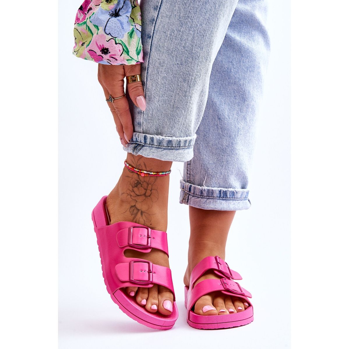 Este modelo, graças ao seu design único com duas alças largas presas por fivela, combina elegância e praticidade. As alças ajustáveis permitem um ajuste perfeito ao pé, aumentando assim o conforto de utilização durante os passeios de verão ou nas compras do dia a dia. Graças a isto, estes chinelos não são apenas um acessório de moda atraente, mas também uma opção funcional para os dias quentes.