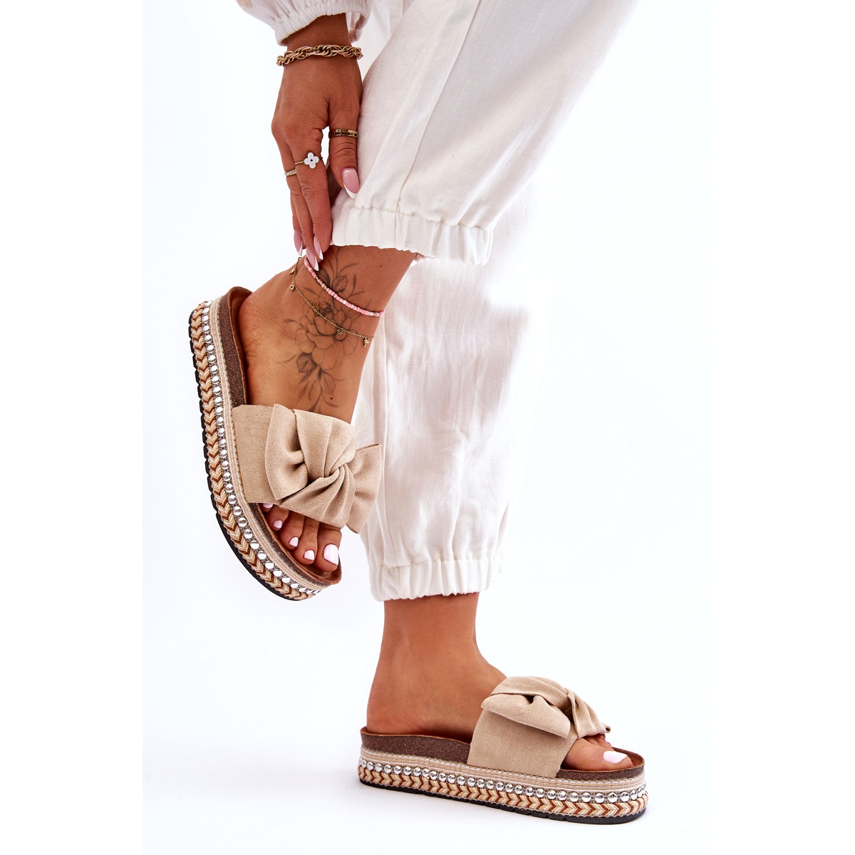 A decoração principal é um impressionante laço na frente da aba, que confere charme e elegância. Os chinelos não possuem biqueira tradicional, o que resulta em seu design exclusivo. A cor bege e um toque adicional de cor bege fazem com que os sapatos combinem com quase todos os estilos, do casual ao mais formal.