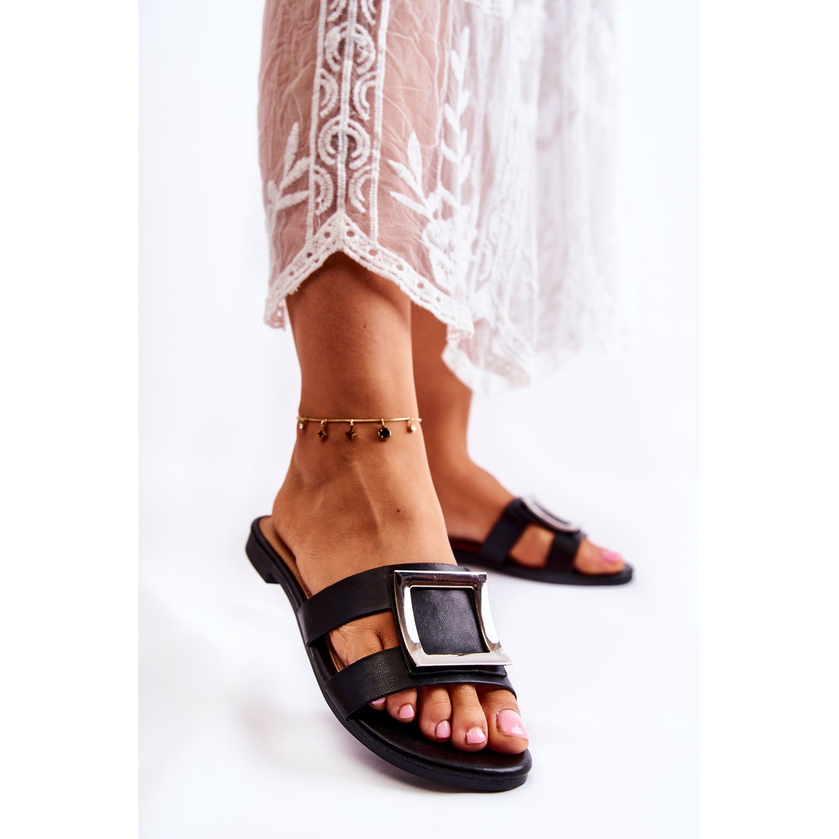Uma palmilha confortável, também confeccionada em couro ecológico, garante conforto durante todo o dia, e um salto plano de apenas 1,5 cm de altura torna os chinelos não só modernos, mas também práticos. Além disso, a sola antiderrapante garante estabilidade e segurança em diversas superfícies.