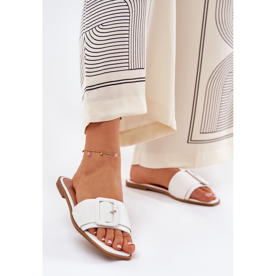 Detalhes: Chinelos femininos de couro eco e fivela branca com uma fivela branca branco