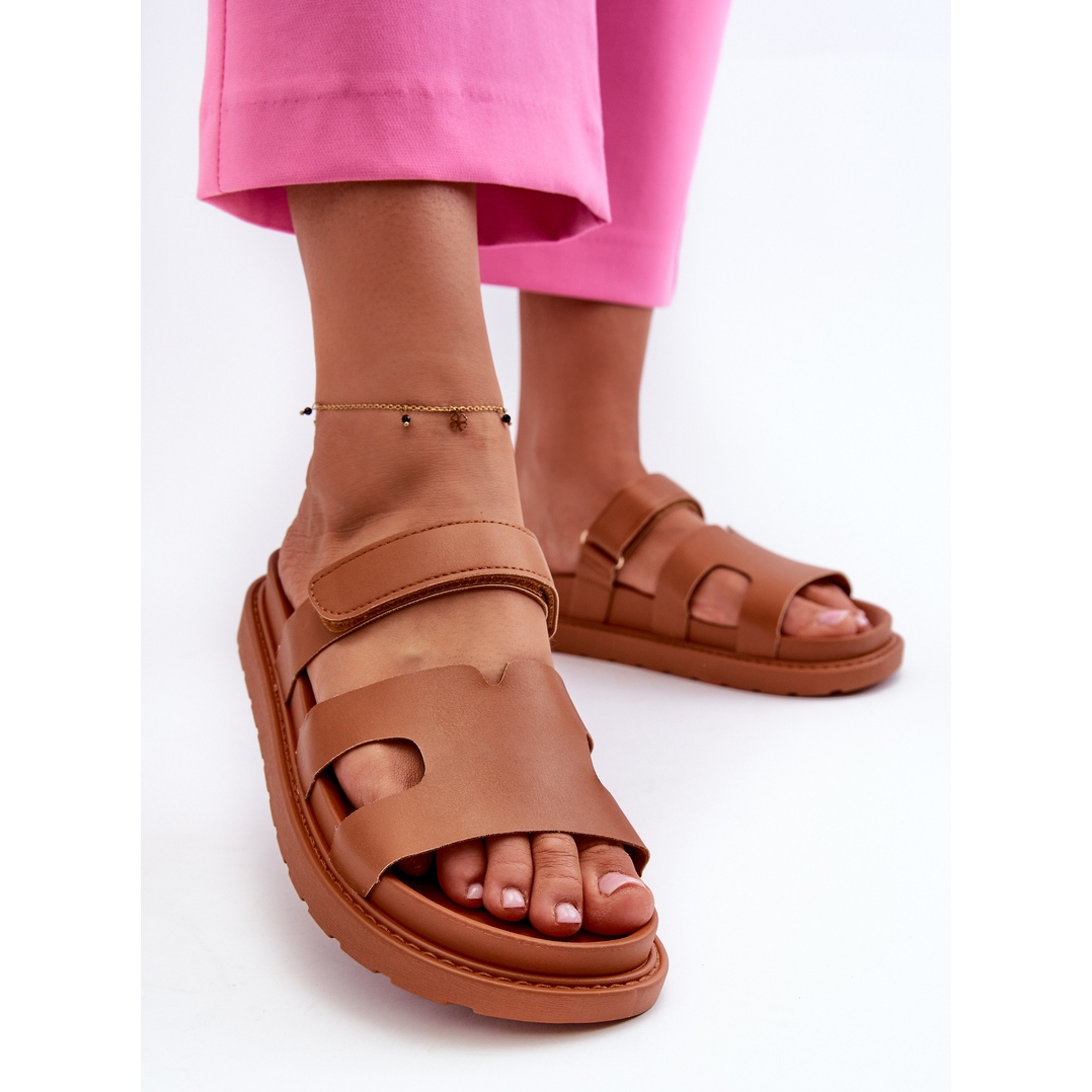 Os chinelos femininos de couro ecológico com velcro na cor marrom combinam perfeitamente com os estilos de verão e seu design universal faz com que combinem com quase qualquer roupa. Vale ressaltar que este modelo não possui nariz, o que aumenta a sensação de liberdade e frescor nos dias quentes.
