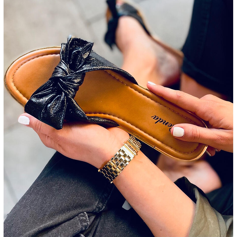 Os chinelos se diferenciam por um acabamento metálico que destaca lindamente o bronzeado festivo e chama a atenção. Um laço charmoso confere-lhes um caráter feminino, tornando-os um complemento perfeito para qualquer guarda-roupa de verão. Graças à sola plana, estes chinelos proporcionam conforto durante todo o dia e cada passo torna-se um prazer.