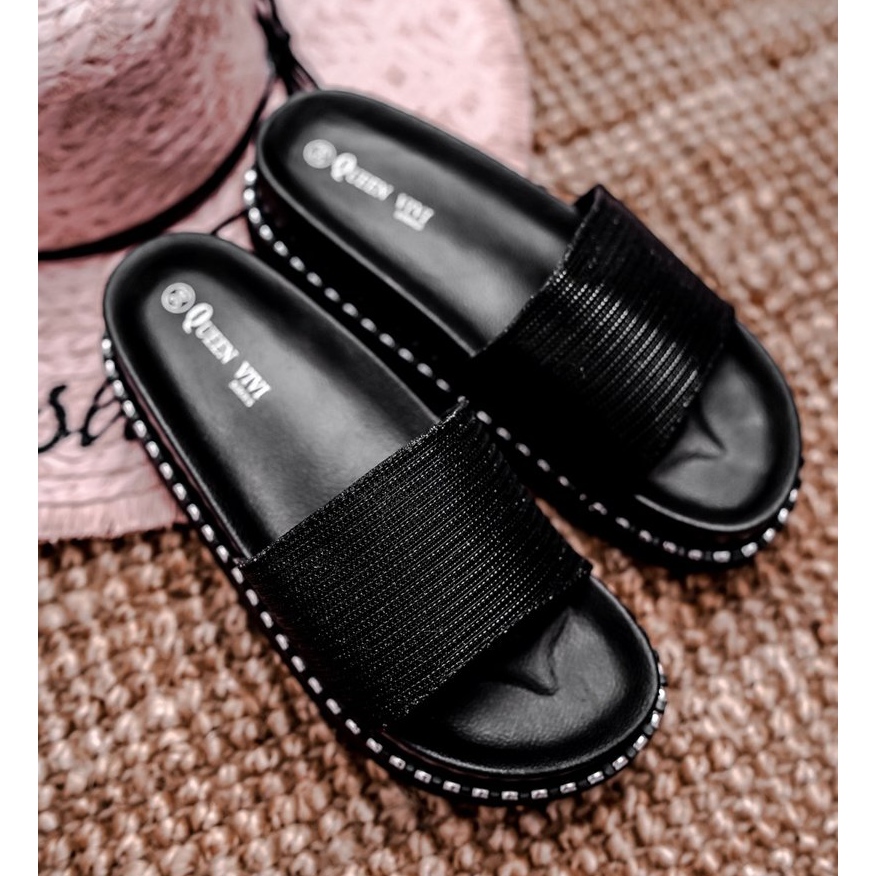 Os chinelos femininos na plataforma Venima - uma combinação de conforto e estilo moderno. Uma sola de plástico preto e clara com detalhes sutis e prateados adiciona caráter, e uma tira decorativa com costura metálica chama a atenção. Modelo escorregado, sem isolamento e sem salto, perfeito diariamente.