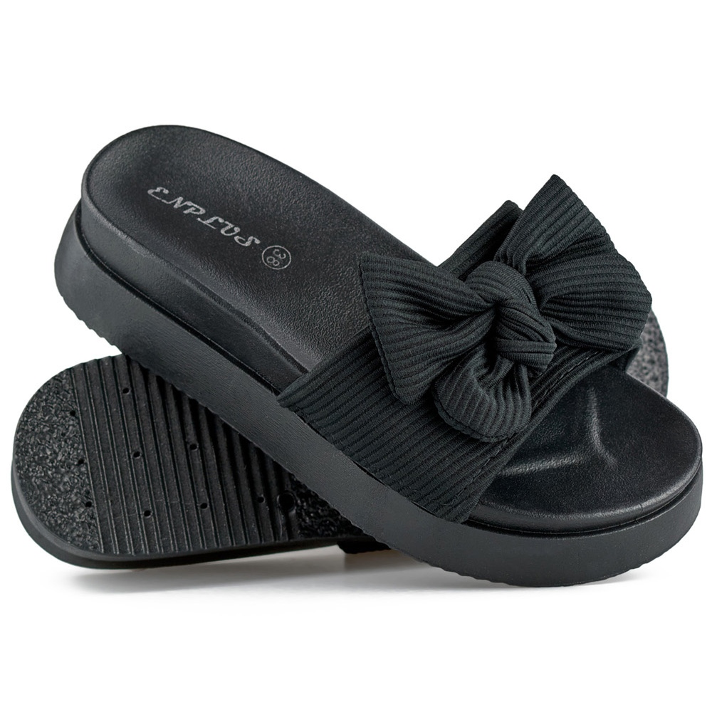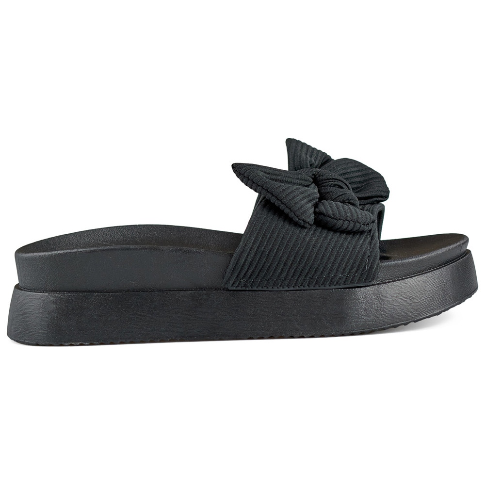 Detalhes: Chinelos femininos negros com laço e sola grossa preto