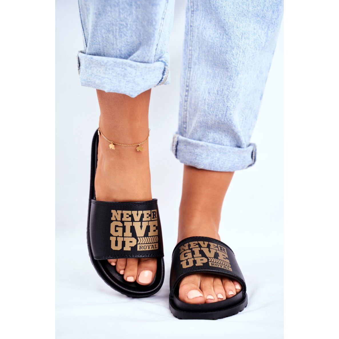 Os chinelos ADY Women's Never Give Up2 em dourado e preto são obrigatórios no guarda-roupa de qualquer mulher. O seu design moderno com a inspiradora inscrição "Nunca desista" torna-os perfeitos não só para o estilo do dia a dia, mas também para viagens de verão à praia ou para relaxar na piscina.