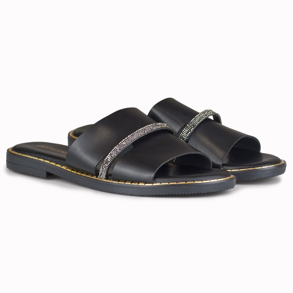 Os chinelos elegantes e femininos negros da coleção Keeshoes de outra marca - perfeitos na primavera e no verão. Feito de couro ecológico de alta qualidade, com uma decoração delicada da Zircônia, combine um visual universal com um brilho sutil. Um salto plano e uma inserção macia proporcionam conforto ao longo do dia, e a forma inserida facilita a cena rapidamente.