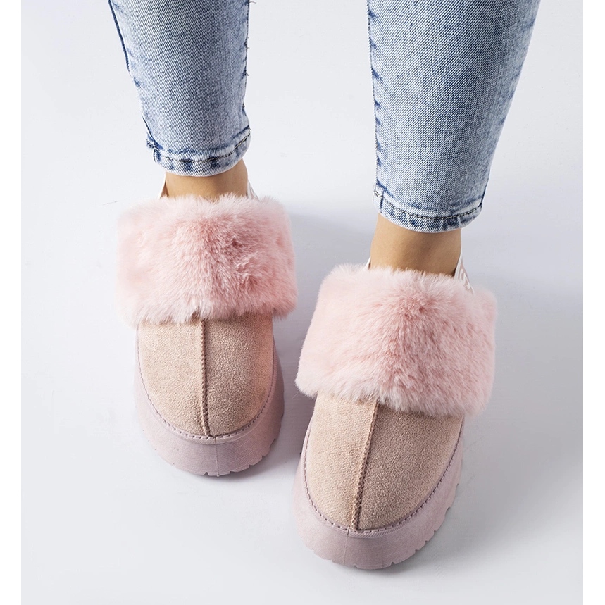 Slippers isolados rosa com uma faixa elástica e peles sangro (modelo QZ23312) - uma combinação de conforto e estilo feminino perfeito para a estação do outono -inverno.