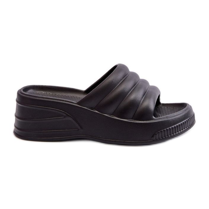 Os chinelos femininos de espuma leve em uma plataforma de cunha e pretos são uma ótima opção para os dias de verão passados na piscina ou no jardim. Feito de plástico de espuma de alta qualidade, eles fornecem não apenas conforto, mas também leveza excepcional, o que faz com que os usassem puro prazer.