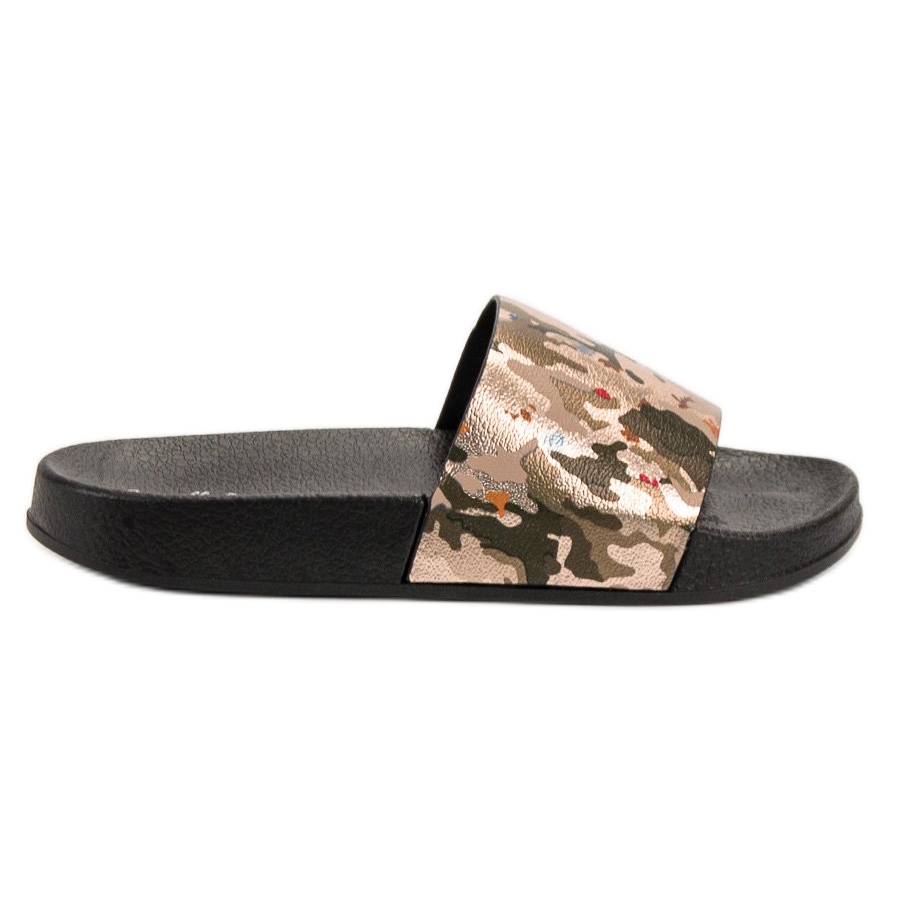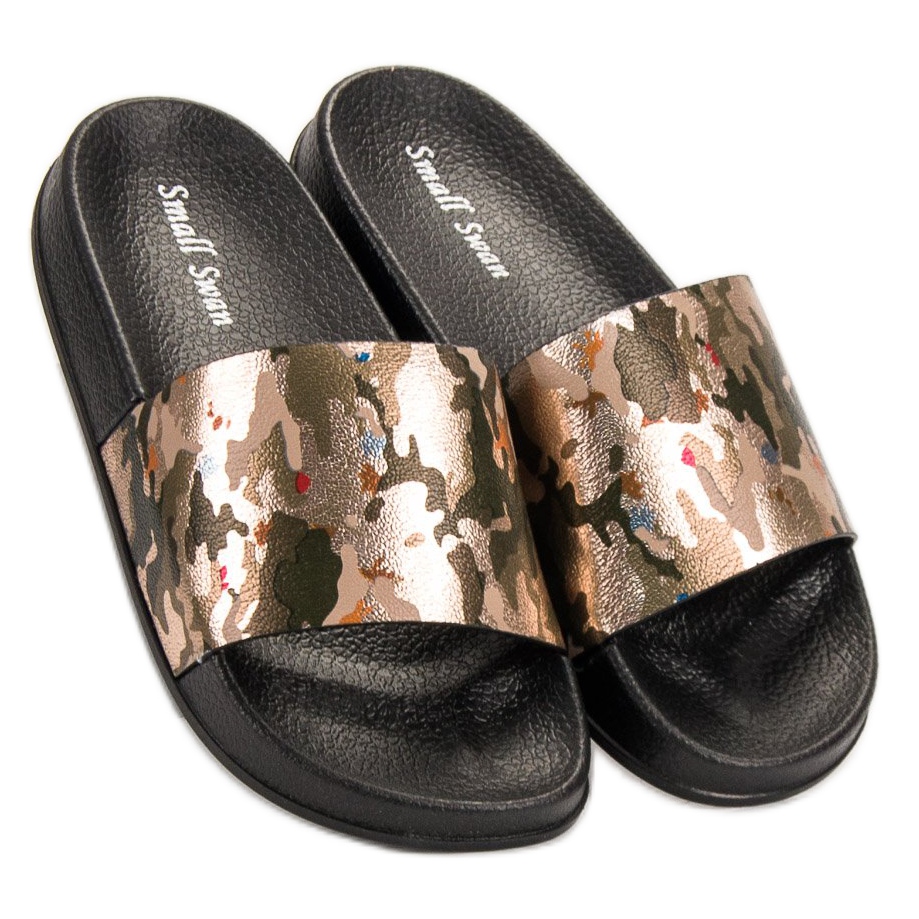 Apresentamos os chinelos SHELOVET em amarelo, que combinam na perfeição o design clássico com uma decoração original. Graças aos interessantes gráficos camuflados, enriquecidos com sutis detalhes dourados, esses chinelos se destacam entre os modelos padrão, adicionando um caráter ligeiramente único a cada estilo.
