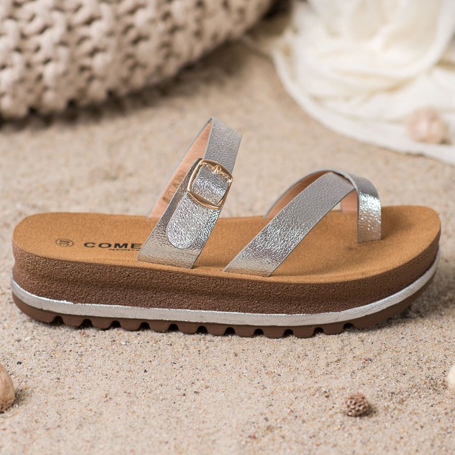 Descubra os chinelos de verão perfeitos - chinelos de plataforma fashion da Comer em uma elegante cor cinza. Estes chinelos prateados com plataforma baixa são a escolha perfeita para todas as mulheres que valorizam estilo e conforto.