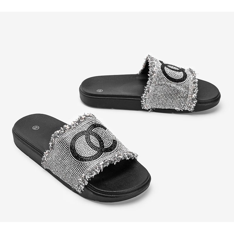 Descubra os chinelos de verão perfeitos - chinelos Olimpia pretos com strass! Estes sapatos exclusivos são a combinação perfeita de conforto e estilo. A parte superior, em plástico de alta qualidade, impressiona pelo seu aspecto e as bordas recortadas conferem-lhes um carácter único. Além disso, toda a superfície dos chinelos é lindamente decorada com zircões brilhantes, que chamam a atenção e conferem elegância a qualquer estilo.