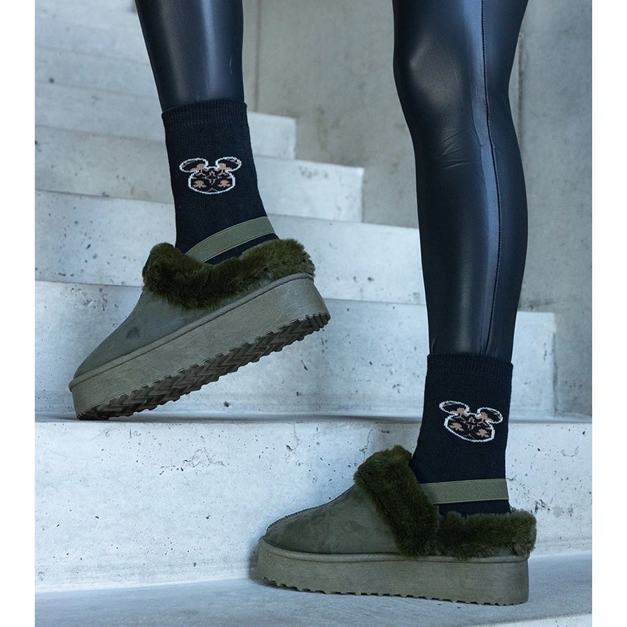 Os chinelos verdes na plataforma Frank são uma ótima opção para todas as mulheres que desejam combinar conforto com estilo elegante nos dias de inverno. Seu forro quente e de pêlo protege efetivamente os pés do frio, e o elástico no calcanhar facilita a colocação e garante a estabilidade ao usar.