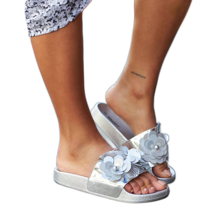 Apresentamos os chinelos Caggio prateados - a escolha perfeita para o estilo do dia a dia! Estes elegantes chinelos com parte superior decorativa impressionam não só pelo seu aspecto moderno, mas também pelo conforto de uso. Confeccionados em couro ecológico de alta qualidade, proporcionam conforto no uso o dia todo.