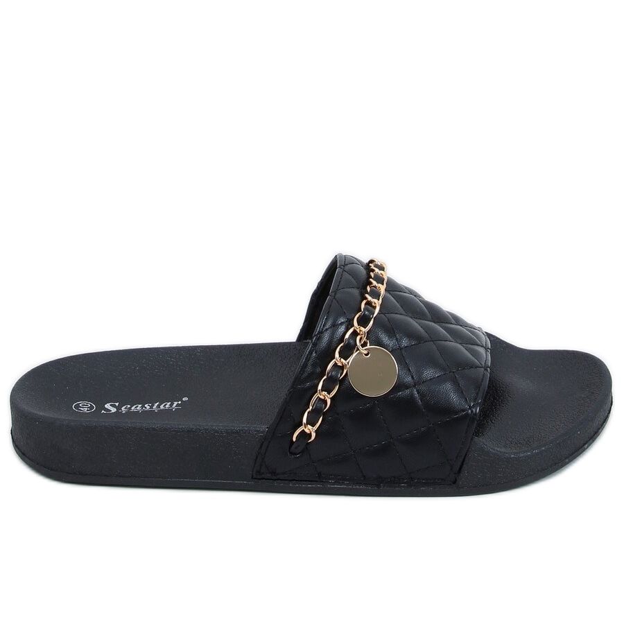 Descubra os exclusivos chinelos pretos CK189P em ouro preto, que se tornaram um símbolo do estilo e elegância do verão. Estes elegantes chinelos femininos são a escolha perfeita para todas as mulheres que querem se destacar na multidão. O acolchoado impressionante e uma linda corrente conferem-lhes um caráter único que atrairá a atenção a cada passo.