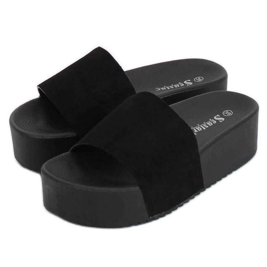 Preto CK76P Os chinelos pretos com sola alta são um must-have no guarda-roupa de qualquer mulher! Estes elegantes chinelos distinguem-se por uma sola moderna e alta, de 5 cm de altura, que confere leveza a cada passo. A palmilha interna perfilada garante conforto de uso mesmo por muito tempo, e a tira larga segura perfeitamente o pé, o que se traduz em estabilidade e confiança ao caminhar.