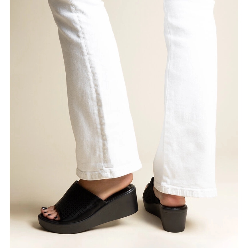 O Black Open Work Flip Flip em uma cunha Eco Leather Garvin é uma ótima opção para os dias de verão que combinam conforto com o design moderno. Feito de couro ecológico de alta qualidade, eles não são apenas revolucionários em seu estilo, mas também ecológicos. O calcanhar médio com uma altura de 6 cm garante estabilidade e conforto do uso, o que os torna calçados perfeitos todos os dias.