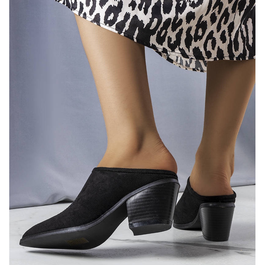 Os slides pretos com frente fechada da Linda são um item obrigatório em qualquer guarda-roupa de verão. Esses chinelos femininos elegantes e confortáveis chamam a atenção pelo seu estilo único, que remete ao calçado cowboy. O salto largo e ligeiramente inclinado de 6 cm de altura e a ponta pontuda conferem-lhes elegância, e a parte superior construída destaca perfeitamente as vantagens do pé.