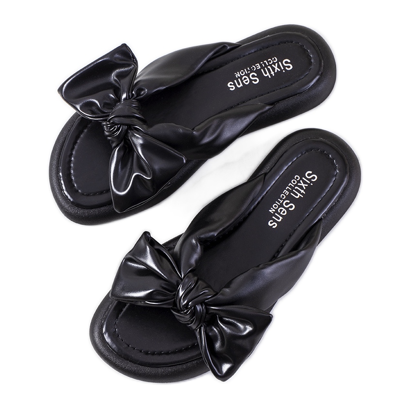 Os chinelos Roio pretos com laço são a escolha perfeita para uma mulher que quer aliar elegância ao conforto. Estes charmosos chinelos, confeccionados em couro ecológico de alta qualidade, garantem não só um caimento perfeito, mas também um estilo único. A palmilha macia e a parte superior fazem com que usá-los seja um puro prazer, perfeito para os dias de verão.