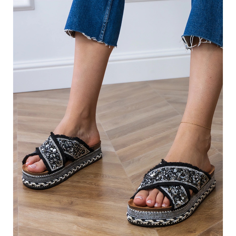 Descubra o estilo incomum e o conforto com chinelos pretos com listras, que são a combinação perfeita de elegância e folga diária. O X5-376 é um clássico que será perfeito no verão, tanto na praia quanto durante as caminhadas da cidade. Sua cor preta minimalista os faz se encaixar em qualquer estilo e, ao mesmo tempo, acrescenta um pouco de brilho graças aos zircões sutis colocados nas listras.
