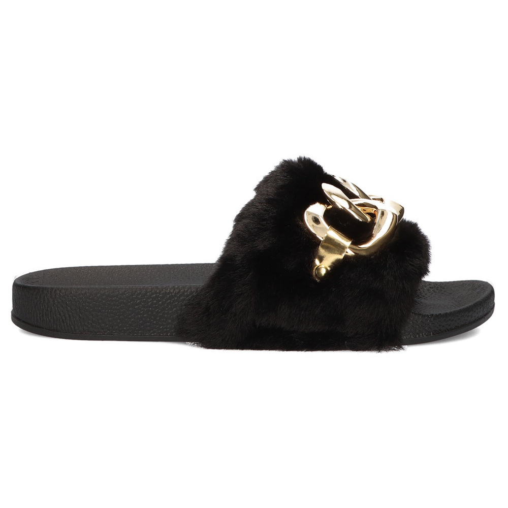 Filippo Filippo Chinelos pretos com pele, corrente dourada QT300