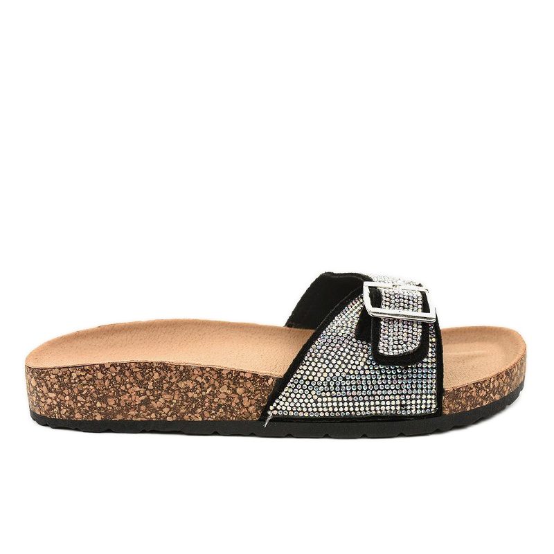 A parte superior dos chinelos é confeccionada em couro ecológico de alta qualidade na cor preta profunda, o que lhes confere um visual não só clássico, mas também elegante. Além disso, os chinelos são decorados com sutis strass prateados e uma fivela atraente, que chamam a atenção e acrescentam originalidade.