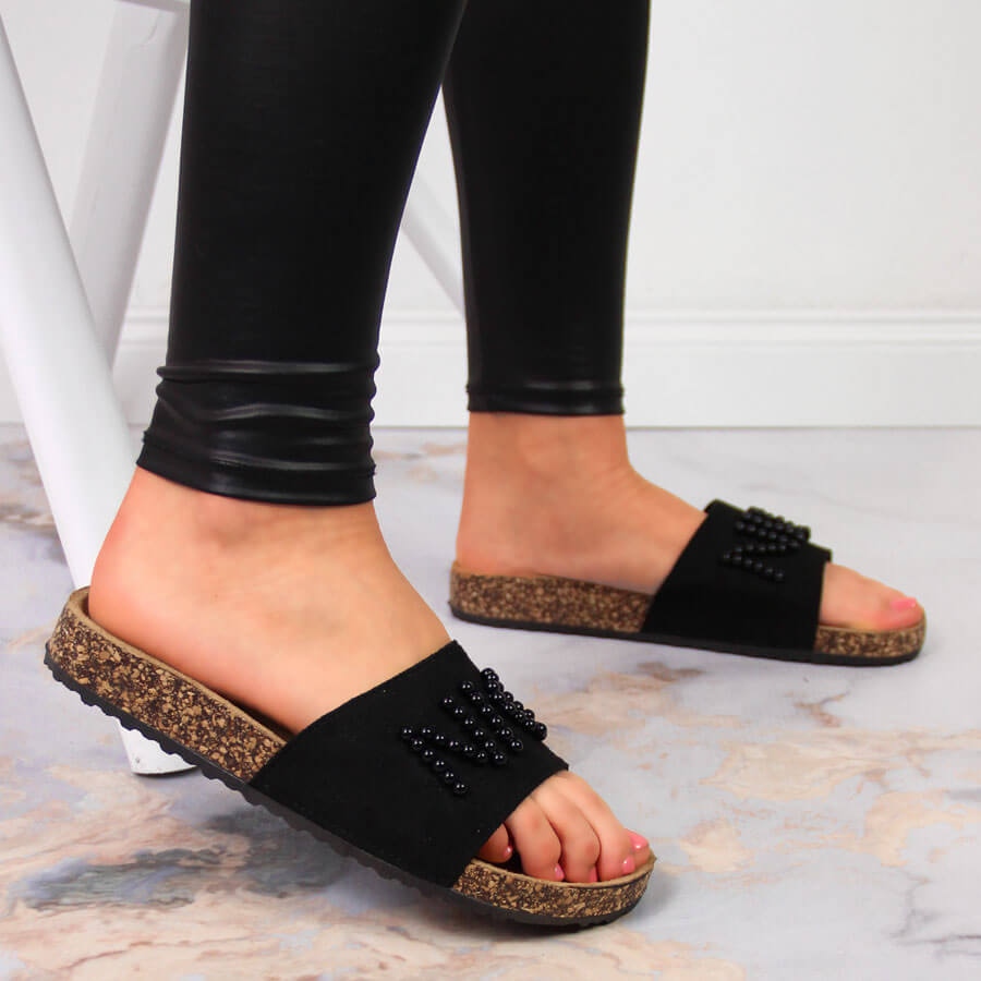 Detalhes: Chinelos pretos de mulher com pérolas eVento