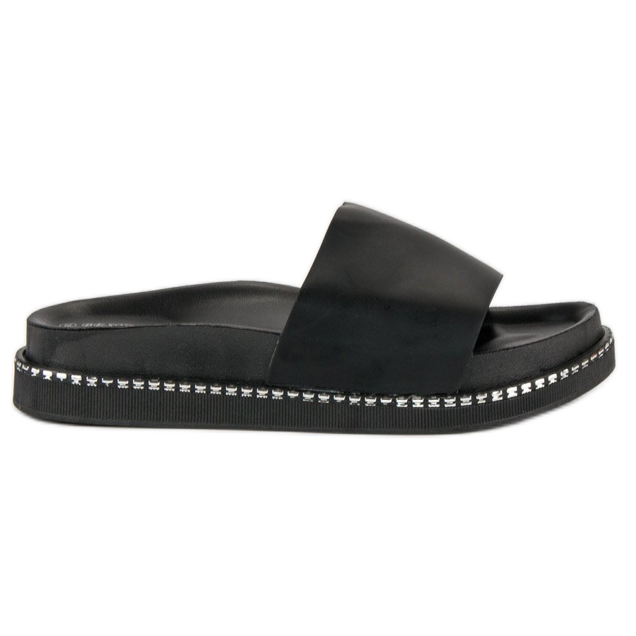 A altura da plataforma de 3 cm acrescenta um toque de elegância sem sacrificar o conforto. Este tipo de calçado é a escolha perfeita para passeios de verão, idas à praia ou tarefas do dia a dia. Graças às suas cores universais, os slides Bestelle pretos podem ser facilmente combinados com qualquer guarda-roupa.