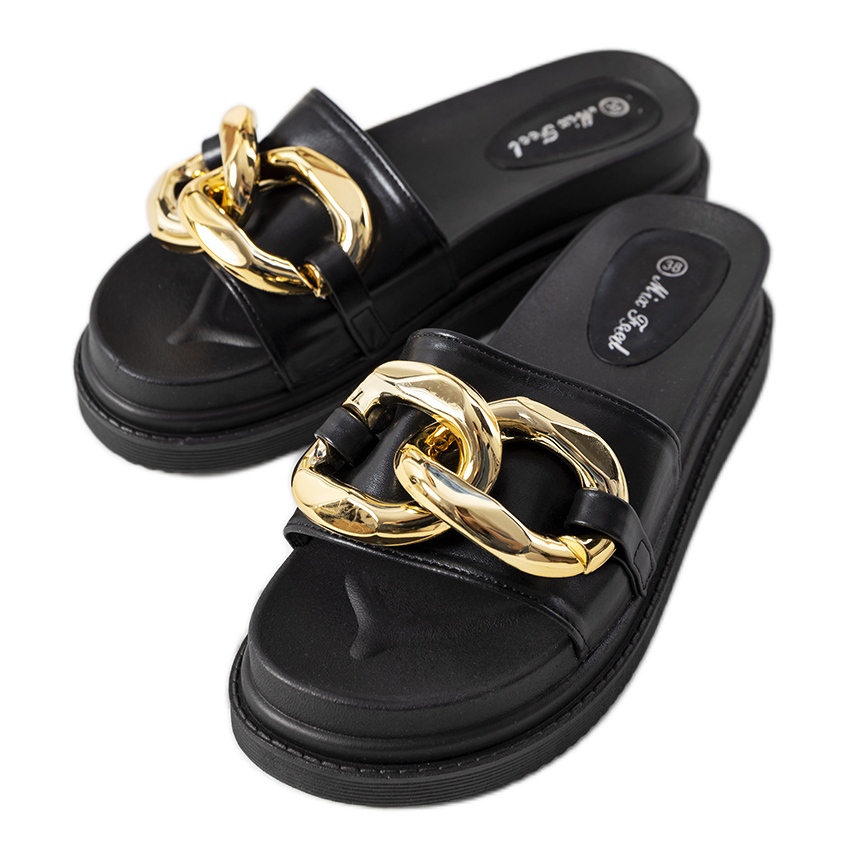 Confeccionados em couro ecológico de alta qualidade, os chinelos Berloz combinam design moderno com funcionalidade. O nariz redondo e a plataforma de 5 cm de altura garantem conforto de uso, e sua clássica cor preta faz com que combinem com qualquer estilo. Uma vantagem adicional é uma corrente sutil que lhes confere um caráter original.