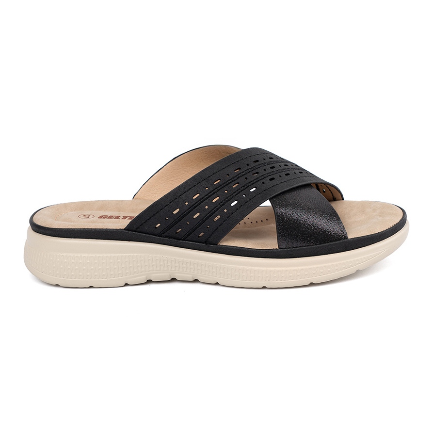 Descubra a elegância e o conforto com abas pretas na plataforma, que combinam perfeitamente o design da moda com o uso de conforto. Feito de couro ecológico de alta qualidade, eles oferecem um padrão de trabalho aberto que lhes dá leveza e frescura. Graças à fixação aberta e ao deslizamento, eles são extremamente práticos e fáceis de usar, o que os torna uma ótima opção para os dias de verão, passeios ou relaxando em casa.