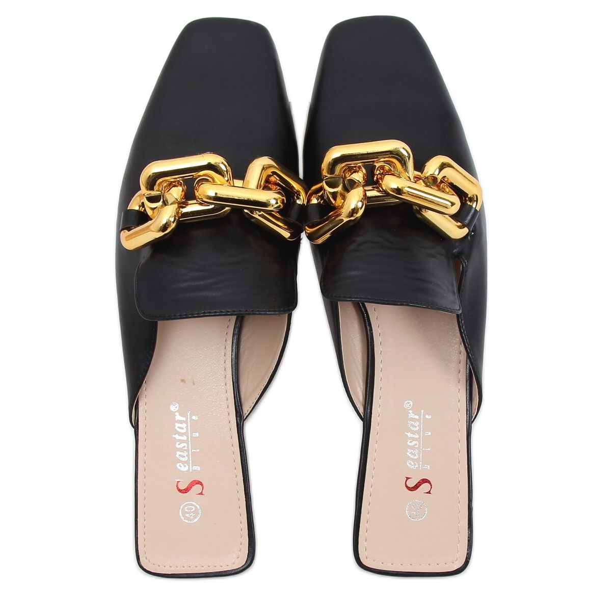 Apresentamos os elegantes chinelos femininos T500P Black, que combinam na perfeição estilo e conforto. Confeccionados em couro ecológico de alta qualidade, estes chinelos pretos destacam-se não só pela estética, mas também pelo design bem pensado. A elegante corrente de ouro na frente do sapato adiciona um caráter moderno e os dedos quadrados enfatizam a elegância.