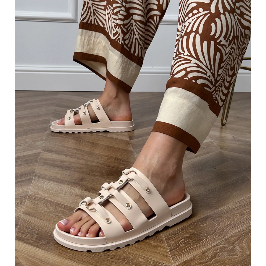 Os chinelos têm um salto plano com uma altura de 3 cm, o que os torna perfeitos para caminhadas longas e saídas diárias. A sombra bege é extremamente versátil, graças à qual você pode combiná -los facilmente com vários estilos - tanto para vestidos arejados quanto calças clássicas. Os strass decorando a parte superior lhes dão originalidade e caráter moderno, atraindo os olhos e adicionando expressividade às suas roupas.