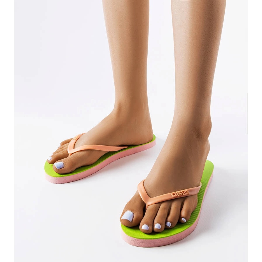 Verde e rosa Big Star FF274A330 Flip-flops-Light, verão e confortável. Deslizamento elegante -Flips femininos da coleção de verão, combinando uma parte superior verde intensa com uma cor rosa energética. Perfeito para a praia, para a cidade e para resultados rápidos em dias quentes.