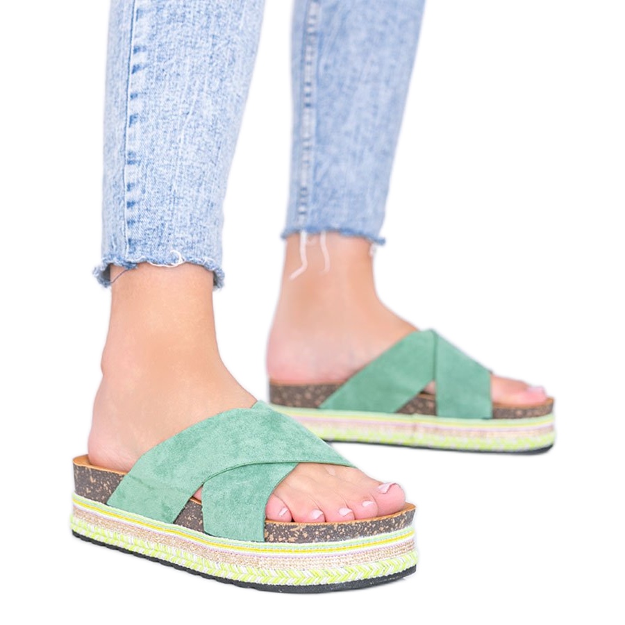 A sola de cortiça decorada com tiras coloridas confere-lhes um carácter único, e as tiras de camurça confeccionadas em pele ecológica num maravilhoso tom de pistache garantem comodidade e conforto de uso. A palmilha contornada abraça o pé, o que a torna a escolha ideal para longas caminhadas de verão.
