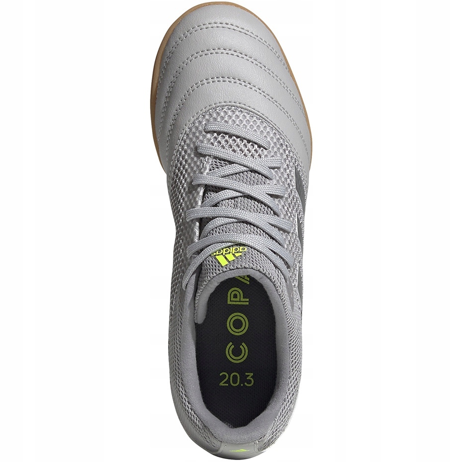 Adidas Copa 20.3 em JR (EF8338) Sapatos de futebol - Relíquias para meninos em Gray, da coleção de pacotes de criptografia. Projetado para um jogo em superfícies internas duras: eles combinam a aparência clássica da linha da Copa com os materiais modernos, oferecendo conforto e controle sobre a bola no nível de recreação/meio -amato.