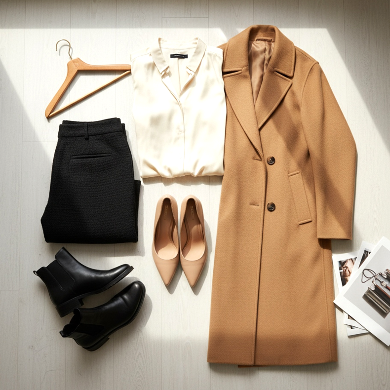 Misturando tons quentes e frios da mesma cor. O marrom caramelo quente dos sapatos vai combinar com o casaco marrom acinzentado frio. Tente combinar tons quentes com tons quentes e tons frios com tons frios.